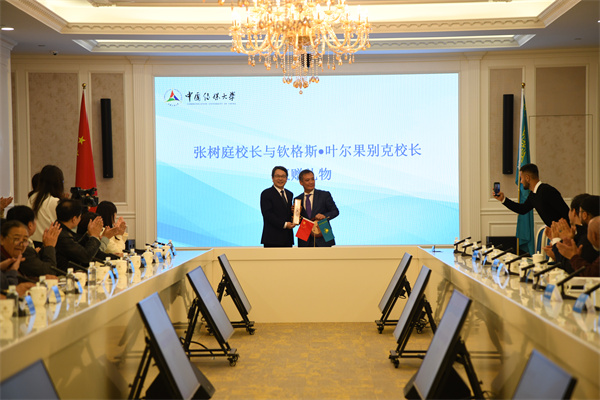 (左:中國(guó)傳媒大學(xué)校長(zhǎng)張樹(shù)庭右:鐵穆?tīng)杽e克·朱爾根諾夫哈薩克國(guó)立藝術(shù)學(xué)院院長(zhǎng)欽格斯·葉爾果別克)