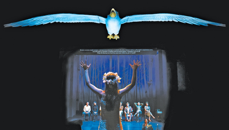 為了實(shí)現(xiàn)這一理念,劇組對(duì)舞臺(tái)進(jìn)行了大刀闊斧的改造,拆除了部分觀眾席座位,使得舞臺(tái)與觀眾席之間形成了一條真實(shí)的“路”。一只巨大的海鷗懸掛在觀眾席上方,成為連接現(xiàn)實(shí)與戲劇世界的紐帶。這種獨(dú)特的舞臺(tái)設(shè)計(jì),讓每一位走進(jìn)劇場(chǎng)的觀眾可以看到一個(gè)與傳統(tǒng)鏡框舞臺(tái)截然不同的開(kāi)放式空間,它打破了舞臺(tái)與觀眾席之間的界限,不僅營(yíng)造出一種開(kāi)放而沉浸的觀演環(huán)境,讓演員的表演更加自然流暢,也讓觀眾能夠更加近距離地感受到劇中人物的情感波動(dòng)和命運(yùn)變遷。