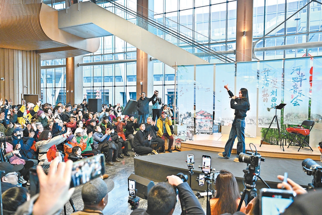 “嗩吶一響,黃金萬(wàn)兩,新的一年,我給大家添添喜氣?!北本┟褡鍢?lè)團(tuán)嗩吶演奏員王向陽(yáng)熟練地向大家問(wèn)了聲好。昨天下午,通州區(qū)遠(yuǎn)洋樂(lè)堤港行人不斷,一段《黃土情》在東區(qū)1層中庭里嘹亮吹響,很快,小舞臺(tái)前便里里外外圍了幾層人,還有不少觀眾放慢腳步,從樓上好奇地向下張望:王向陽(yáng)帶三支嗩吶上臺(tái),《百鳥(niǎo)朝鳳》吹得酣暢淋漓,二胡演奏員孫曉煜弓弦急動(dòng),《賽馬》氣勢(shì)奔騰,竹笛演奏員蔣錦雯用排簫吹起《月亮代表我的心》,溫柔舒展。約一個(gè)小時(shí)的演出,喝彩連連,掌聲不斷,周末時(shí)光被音樂(lè)溫暖點(diǎn)亮。