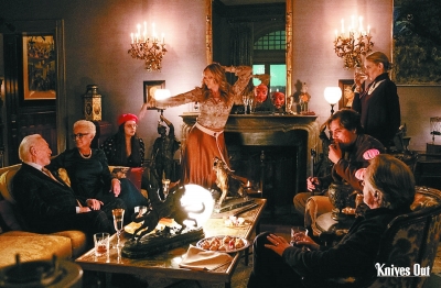 從觀感上講,《利刃出鞘》有著極其顯著的、向推理小說女王阿加莎·克里斯蒂致敬的意味。雖然電影故事發(fā)生的背景是當(dāng)下的美國,但是構(gòu)建影片的各種元素——與世隔絕的宏偉莊園、乖戾而富有的死者、貌合神離各懷鬼胎的嫌疑人、行為怪誕不按常理出牌的偵探等,以及在看似不重要的情節(jié)與臺詞中埋藏直刺真相的鋒利線索、以巧合陡峭又令人叫絕的角度起底案件等敘事方式,都與阿婆的經(jīng)典風(fēng)格十分肖似。不過,《利刃出鞘》之所以會廣受好評,除了有巧妙運(yùn)用經(jīng)典推理電影范式的原因,更關(guān)鍵的也許是在于其“反經(jīng)典”的突破與創(chuàng)新。