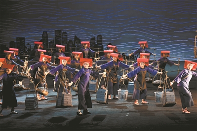 此次,觀眾在《紅頭巾》中看到了很多現(xiàn)代藝術(shù)手段。比如,3個(gè)男子男扮女裝去招工的舞蹈,不僅展現(xiàn)了傳統(tǒng)戲曲里的丑角特色,也讓人想到了近年來讓人捧腹的男版“四小天鵝”之舞。而尾聲處3個(gè)報(bào)童用說唱的形式播報(bào)1945年至1953年之間的重大新聞事件,也具有濃烈的現(xiàn)代性。這些歌舞化的運(yùn)用都非常新穎,詼諧的表演,律動(dòng)的節(jié)奏,調(diào)和了整個(gè)劇的氛圍和觀眾的情緒。