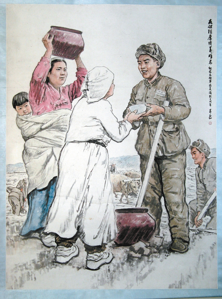 蔣兆和畫作《友誼深厚情義難忘》 ??在展廳里,有一幅蔣兆和創(chuàng)作的中國畫《友誼深厚情義難忘》,畫中的“紀(jì)念志愿軍抗美援朝十周年”題跋道出了其創(chuàng)作的時(shí)間。畫面的主體是兩位朝鮮婦女正為志愿軍戰(zhàn)士送水,其中一位婦女還背著可愛的幼兒。在幾位主要人物的身后,畫家細(xì)致地描繪了志愿軍戰(zhàn)士們在農(nóng)田幫助朝鮮人民恢復(fù)農(nóng)業(yè)生產(chǎn)的場景。在中朝軍隊(duì)打退以美國為首的“聯(lián)合國軍”、朝鮮停戰(zhàn)協(xié)定簽訂后,志愿軍在鞏固防守的同時(shí),還幫助朝鮮人民建設(shè)新家園,與朝鮮人民結(jié)下了深厚情誼。