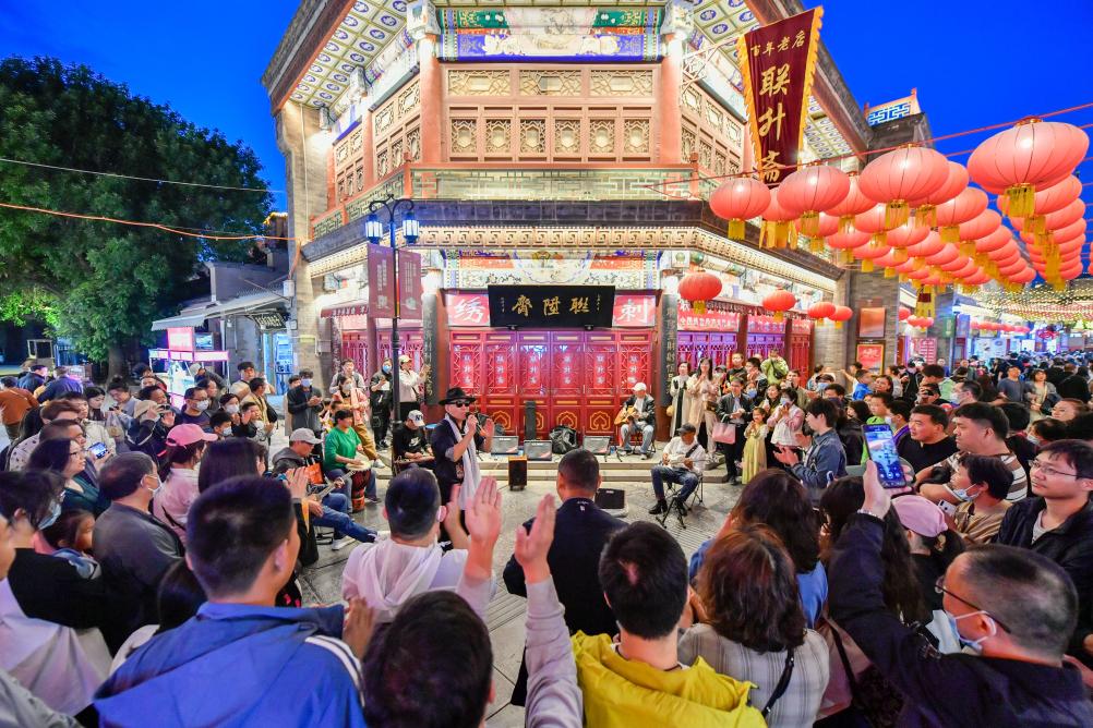 游客在天津古文化街欣賞歌手演唱。新華社記者 孫凡越 攝
