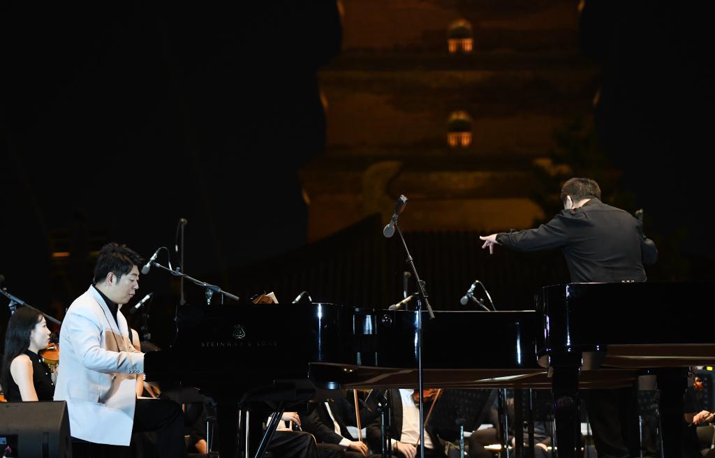 9月10日晚,鋼琴家郎朗與西安交響樂團(tuán)在西安大雁塔北廣場戶外公演。新華社記者 李一博 攝