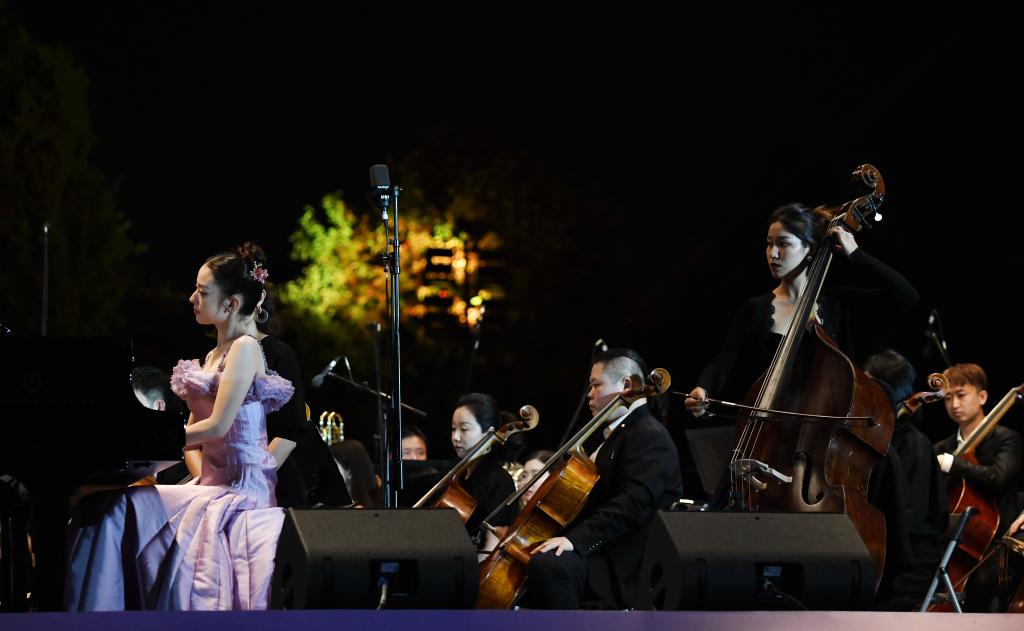 9月10日晚,鋼琴家吉娜·愛麗絲(前左)與西安交響樂團(tuán)在西安大雁塔北廣場戶外公演。新華社記者 李一博 攝