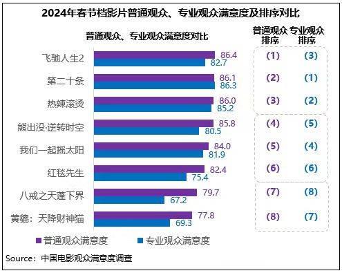 中國電影觀眾滿意度調(diào)查?2024年春節(jié)檔調(diào)查結(jié)果顯示,春節(jié)檔觀眾滿意度得分85.9分,為2015年以來調(diào)查9個(gè)春節(jié)檔的第二名,同時(shí)居歷史調(diào)查各檔期滿意度第四位。檔期調(diào)查的8部影片中有4部超85分(《飛馳人生2》86.2分、《第二十條》86.1分、《熱辣滾燙》85.9分、《熊出沒·逆轉(zhuǎn)時(shí)空》85.5分),數(shù)量和2023年同期持平,均為歷年春節(jié)檔之最。檔期多元化佳作頻出,以優(yōu)質(zhì)創(chuàng)作獲得觀眾高滿意度評價(jià),再度掀起春節(jié)全民觀影熱潮。
