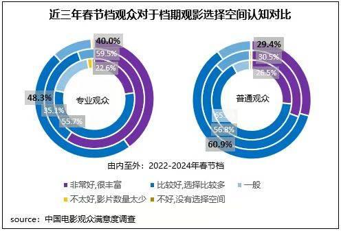2024年春節(jié)檔優(yōu)質(zhì)的影片內(nèi)容矩陣有效拉動(dòng)觀影及討論氛圍,檔期內(nèi)有合計(jì)90.3%的普通觀眾認(rèn)為檔期觀影選擇空間“非常好”或“比較好”,這一占比較去年同期高出2.9個(gè)百分點(diǎn);專業(yè)觀眾這一占比為88.3%,略低于去年同期。