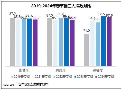 同時(shí),在檔期滿意度三大指數(shù)中,傳播度87.6分,為三大指數(shù)中最高,居歷史調(diào)查春節(jié)檔的第二位;檔期觀賞性得分85.5分,思想性得分85.4分,均居歷史調(diào)查春節(jié)檔的第四位。《飛馳人生2》《熱辣滾燙》和《第二十條》居檔期傳播度前三位,其中《熱辣滾燙》是普通觀眾傳播方式得分最高影片,為86.7分,《第二十條》為專業(yè)觀眾傳播方式得分最高影片,達(dá)滿分100分。