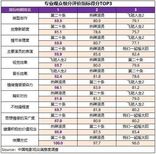 在專業(yè)觀眾評價(jià)體系中,《第二十條》的類型創(chuàng)作、創(chuàng)意新穎度、情節(jié)合理度、主要演員的表演、不枯燥、思想情感的深廣度和傳播方式7項(xiàng)指標(biāo)得分均居檔期首位,《熱辣滾燙》的情緒情感感染力、精彩對白和健康積極的價(jià)值觀念為第一名,《飛馳人生2》的視覺效果、音樂效果獲得檔期最高評分。另外,《我們一起搖太陽》的主要演員的表演、思想情感的深廣度、健康積極的價(jià)值觀念和傳播方式得分也進(jìn)入檔期前三位。