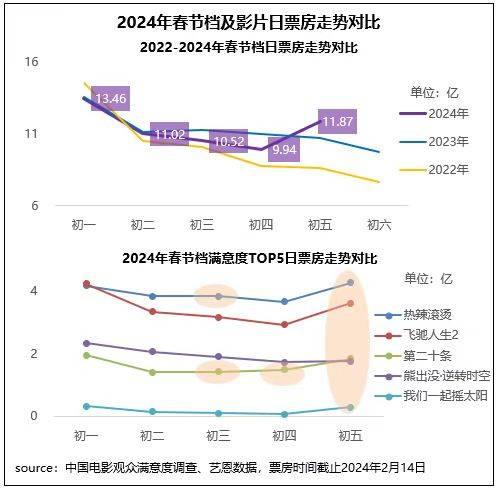 高滿意度加持下,2024年春節(jié)檔觀影及討論高潮不斷,檔期觀影人次連續(xù)六年破億,初一大盤票房再破13億元,初二初三連續(xù)保持10億+量級,并在2月14日實(shí)現(xiàn)大幅逆跌至近12億,同時(shí)檔期高滿意度影片也出現(xiàn)多次逆跌。檔期票房走勢穩(wěn)健且綜合表現(xiàn)顯現(xiàn)后勁較強(qiáng),隨著高滿意度影片的優(yōu)質(zhì)口碑持續(xù)發(fā)酵,長線票房仍具備較大增長空間。