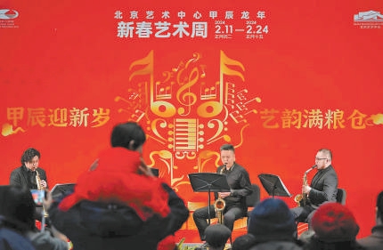 北京藝術(shù)中心也是張燈結(jié)彩,集合音符、北京藝術(shù)中心外觀、龍年等元素的“春”字海報(bào)處處皆是,靈活多變的室內(nèi)樂(lè)重奏飄揚(yáng)在公共區(qū)域中,撒下一顆顆藝術(shù)普及的種子。