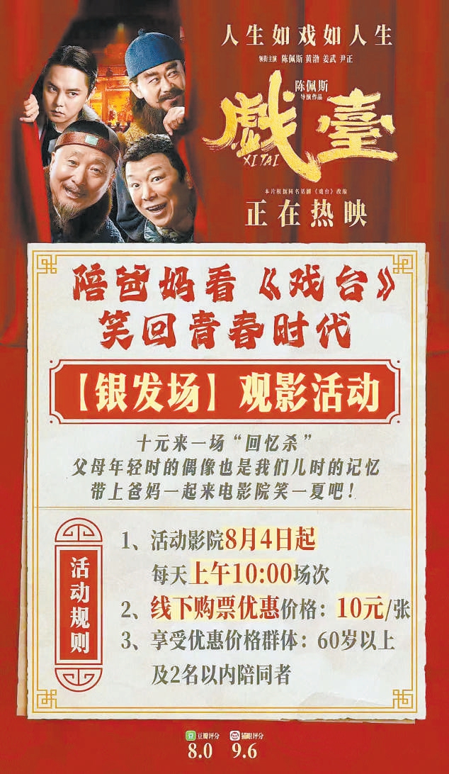 《戲臺》則推出“銀發(fā)場”特惠活動。“效果特別好,線上線下都傳開了,很多觀眾打電話來咨詢。”馮賀楠說,北京大約四分之一的影院都有“銀發(fā)場”,他所在影院的“銀發(fā)場”上座率在《戲臺》所有場次中是最高的。 (北京晚報記者 袁云兒)