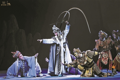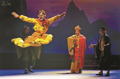 此外,該劇還利用舞臺(tái)技術(shù)突破了傳統(tǒng)戲曲的節(jié)奏,使之更為緊湊連貫。比如白骨精定下計(jì)謀要去偵探唐僧情況時(shí),舞臺(tái)光暗,一個(gè)發(fā)光小球飛升直達(dá)天幕,暗示白骨精元神飛出洞府,同時(shí)伴有類似影視音效作為烘托;而在唐僧狠心驅(qū)逐孫悟空時(shí),孫悟空向八戒沙僧交代完后,從上場門下場,后場馬上就安排一個(gè)孫悟空替身吊威亞從上場口飛到下場口,過程連貫自然,這都是受到電影藝術(shù)啟發(fā)的創(chuàng)新。