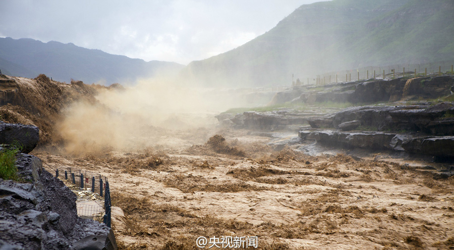 受上游強(qiáng)降雨和水庫放水影響,最近幾天,黃河壺口瀑布迎來伏汛,最大水流量達(dá)到每秒2600立方米左右,濁流滾滾奔騰而下,氣勢(shì)磅礴?。ㄑ胍曈浾呃钪?文豪)