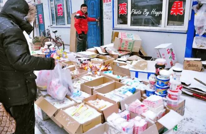 當然漠河那么冷,很多東西是不用放在室內(nèi)賣的,比如冰棍、雞鴨魚肉、還有部分水果,天然的冰箱。