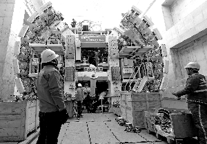 北京晨報(bào)記者在現(xiàn)場(chǎng)看到,各種吊車、大型作業(yè)機(jī)器正在緊張作業(yè)中。記者走到隧道“洞口”處看到, 腳下一臺(tái)巨型的盾構(gòu)機(jī)呈現(xiàn)在眼前,由于隧道采用明挖法、暗挖法、盾構(gòu)法相結(jié)合的施工作業(yè)方法,據(jù)記者目測(cè),從盾構(gòu)機(jī)最底端到記者所在的地面約有七八層樓高。幾十名施工人員正冒著寒風(fēng)對(duì)盾構(gòu)機(jī)進(jìn)行組裝、吊裝。北京晨報(bào)記者了解到,這臺(tái)巨型盾構(gòu)機(jī)直徑達(dá)11米左右。