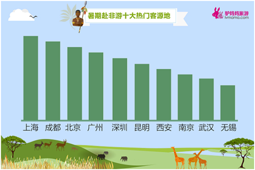 驢媽媽旅游網(wǎng)(以下簡(jiǎn)稱,驢媽媽)數(shù)據(jù)顯示,今年暑期赴非游預(yù)訂人次同比上漲近2倍,赴非旅游熱情持續(xù)高漲,8月中上旬將迎來暑期出游最高峰。其中,追求獨(dú)特旅游體驗(yàn)且有一定經(jīng)濟(jì)實(shí)力的25-40歲游客是赴非洲旅游的主力客群,該年齡段占比超7成;國內(nèi)城市中,上海、成都、北京、廣州、深圳、昆明、西安、南京、武漢、無錫成為十大熱門客源地。
