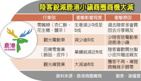 大陸游客減少后,臺(tái)灣旅游業(yè)“冷颼颼”。據(jù)臺(tái)灣《中國(guó)時(shí)報(bào)》報(bào)道,過(guò)去大陸游客團(tuán)赴臺(tái),若住宿中部準(zhǔn)備出發(fā)前往日月潭途中,必定會(huì)先到訪鹿港小鎮(zhèn)。民意代表王惠美觀察,大陸游客不來(lái)之后,光是中山路上的店家生意就掉了一半。觀光電動(dòng)車、賣小吃和皮件的攤商感受最深,曾經(jīng)忙到應(yīng)接不暇的導(dǎo)覽解說(shuō)員,現(xiàn)在只能主動(dòng)出擊,通過(guò)民間協(xié)會(huì)發(fā)函邀請(qǐng)大陸游客組團(tuán)赴臺(tái)交流參訪。