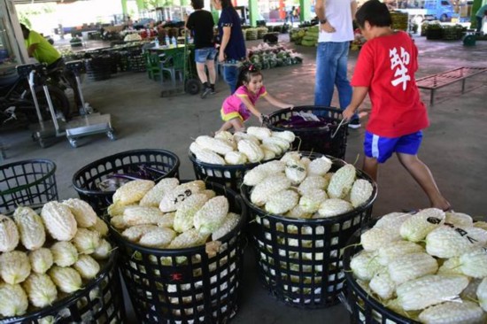 臺(tái)東在地苦瓜、絲瓜滯銷,價(jià)格下跌,在果菜市場(chǎng)幫忙的小朋友,請(qǐng)大家多采購(gòu)好吃又便宜的苦瓜。(圖片來(lái)源:臺(tái)灣《中時(shí)電子報(bào)》)