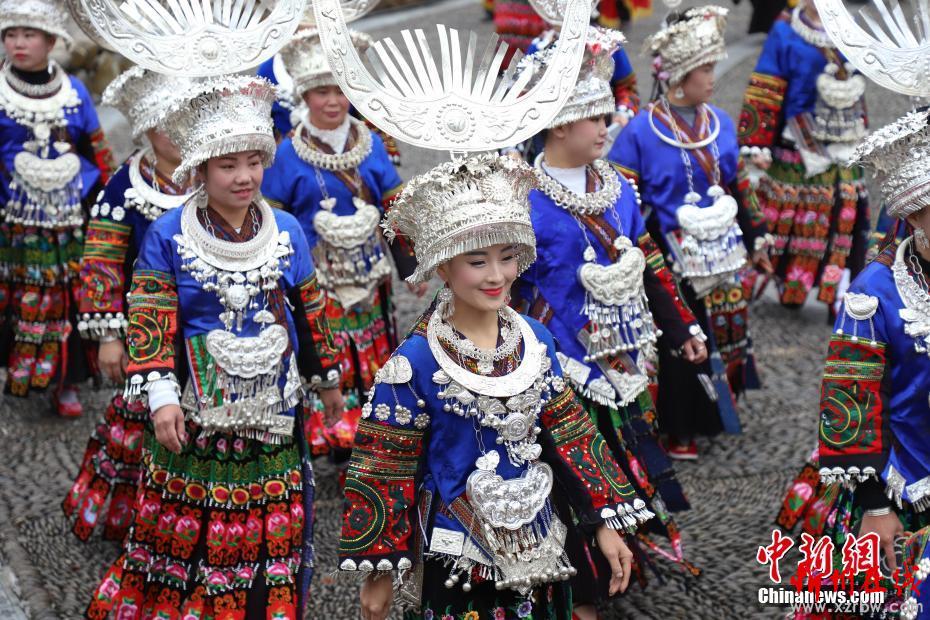 11月18日,苗族姑娘穿著盛裝參加巡游。當(dāng)日,貴州省黔東南苗族侗族自治州雷山縣舉行2018苗年巡游活動,來自海內(nèi)外的上萬名游客和當(dāng)?shù)孛缱逋黄饸g聚,慶祝苗族新年。中新社記者 瞿宏倫 攝