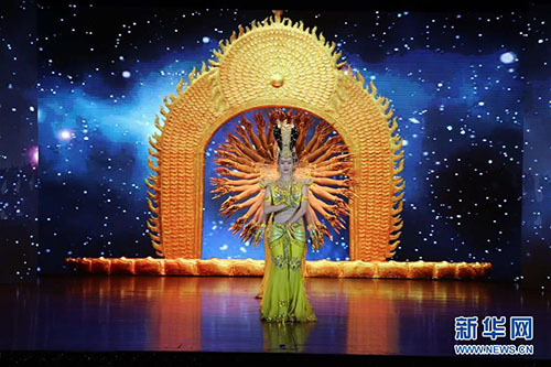 1月30日,在柬埔寨金邊,來自中國殘疾人藝術(shù)團的演員在表演《千手觀音》。