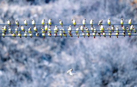 從去年10月下旬開(kāi)始,有大量的小太平鳥(niǎo)進(jìn)入沁源縣境內(nèi),主要棲息在靈空山自然保護(hù)區(qū)、菩提山森林公園等地,到今年2月下旬,鳥(niǎo)群逐漸增多。本周以來(lái),已有近萬(wàn)只小太平鳥(niǎo)棲息于沁源縣境內(nèi),場(chǎng)面頗為壯觀,為綠色沁源又增添了一道亮麗的風(fēng)景。圖為3月28日沁源縣境內(nèi)拍攝的一群小太平鳥(niǎo)。