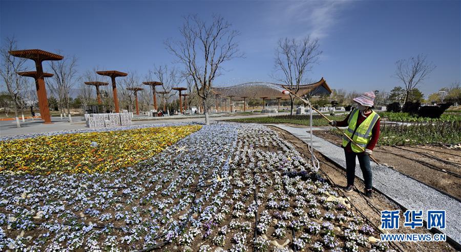 4月14日,園林工人在澆灌新種植的花卉。 近期,北京世園會(huì)園區(qū)景觀(guān)恢復(fù)工作全面啟動(dòng),將在4月28日前恢復(fù)近5萬(wàn)平米的世園標(biāo)志性花卉景觀(guān),以及70余個(gè)室外展園。 新華社記者 李欣 攝