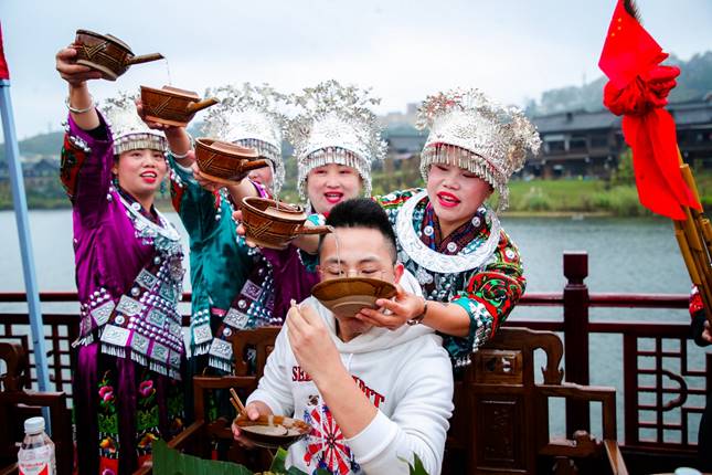 配合著各類美食,苗家春宴里不僅有十八道“攔門酒”、“高山流水”等花式敬酒,還有廣場迎賓舞、苗族八大支系盛裝巡游等多項苗、侗等少數(shù)民族的特色活動。其中最值得一提的,便是宴席開始前丹寨錦雞舞的表演,在苗族傳統(tǒng)蘆笙伴奏下,身著銀角冠服飾的苗族姑娘如錦雞般翩翩起舞,銀飾躍躍欲飛,銀角冠一點一搖,腿邊花帶一飄一閃,舞者步履輕盈,悠然搖擺,歡樂的氣氛讓人胃口大開。