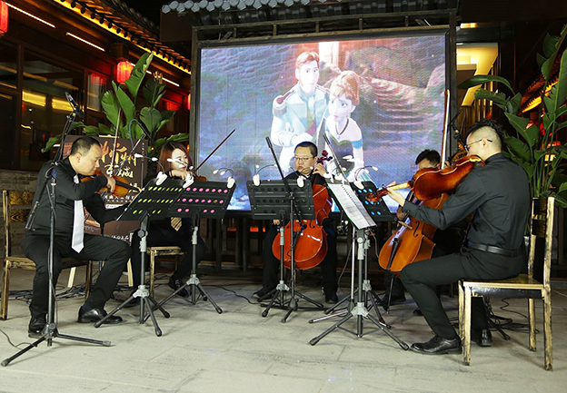 人民網忻州6月2日電(李夢文)6月1日晚8點30分,華燈璀璨的忻州秀容古城突然傳來一陣優(yōu)美的西洋音樂,街邊游客循著音樂聲聚集到河曲院落?!讹L中奇緣》《冰雪奇緣》《美女與野獸》《天空之城》《千與千尋》,隨著這一首首耳熟能詳?shù)臉非谝魳芳沂种辛魈识?,聽眾也越來越多,越來越激動?/p>