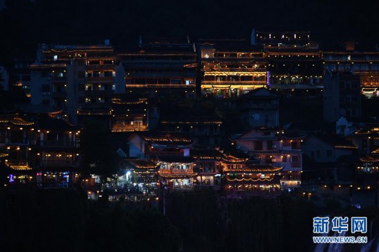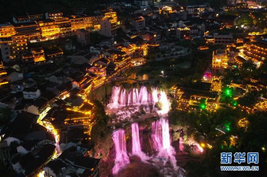 近日,湘西土家族苗族自治州永順縣芙蓉鎮(zhèn)景區(qū)在做好疫情防控的情況下恢復(fù)開放。夜幕降臨,景區(qū)內(nèi)的瀑布、吊腳樓與燈光交相輝映,美不勝收,吸引許多游客前來休閑、參觀。