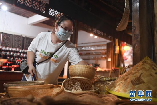 6月11日,游客在湘西土家族苗族自治州永順縣芙蓉鎮(zhèn)景區(qū)內(nèi)選購(gòu)手工制作的旅游商品。 新華社記者 薛宇舸 攝