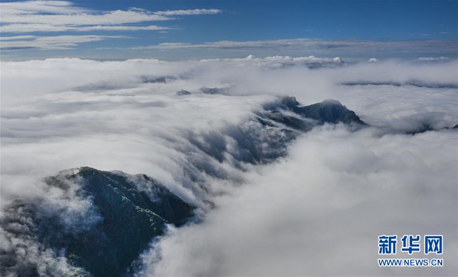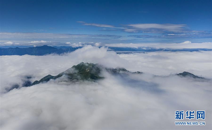 6月10日拍攝的漢中市南鄭區(qū)龍頭山主峰云海景觀(無人機照片)。 新華社記者 陶明 攝
