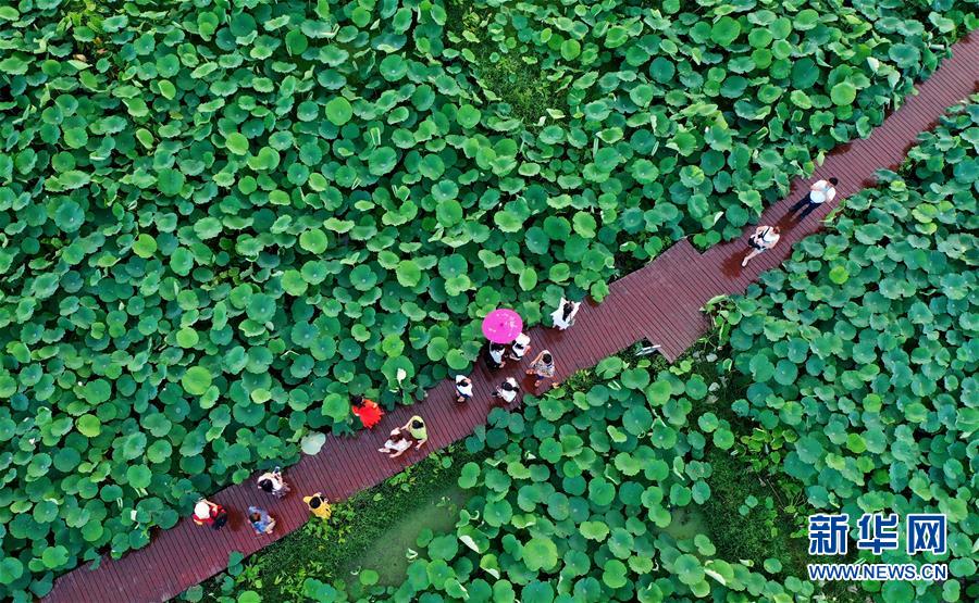 6月28日,游客在廣西柳州市柳江區(qū)百朋鎮(zhèn)萬(wàn)畝荷塘里游玩。新華社發(fā)(黎寒池 攝)