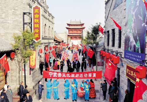 ——民俗文藝巡演“聚人氣”,引燃主題活動。鑼鼓聲陣陣響起,宣傳月款款而來。寧武縣文體中心把舞獅、旱船、民歌、晉劇、小秧歌、二人臺、廣場舞、北路梆子、旗袍走秀等具有寧武地方韻味的節(jié)目搬到忻州古城南北大街、泰山廟和關(guān)帝廟活動現(xiàn)場,輪番上演,傾情打造了一場熱鬧溫馨、雅俗共賞的旅游盛宴,吸引市民和游客駐足圍觀。 “我從頭到尾觀看他們的歌舞表演,對寧武及這個地方的文藝有了了解,有機會我一定去寧武親身感受一番。”來自太原的游客秦朝義有感而發(fā)。