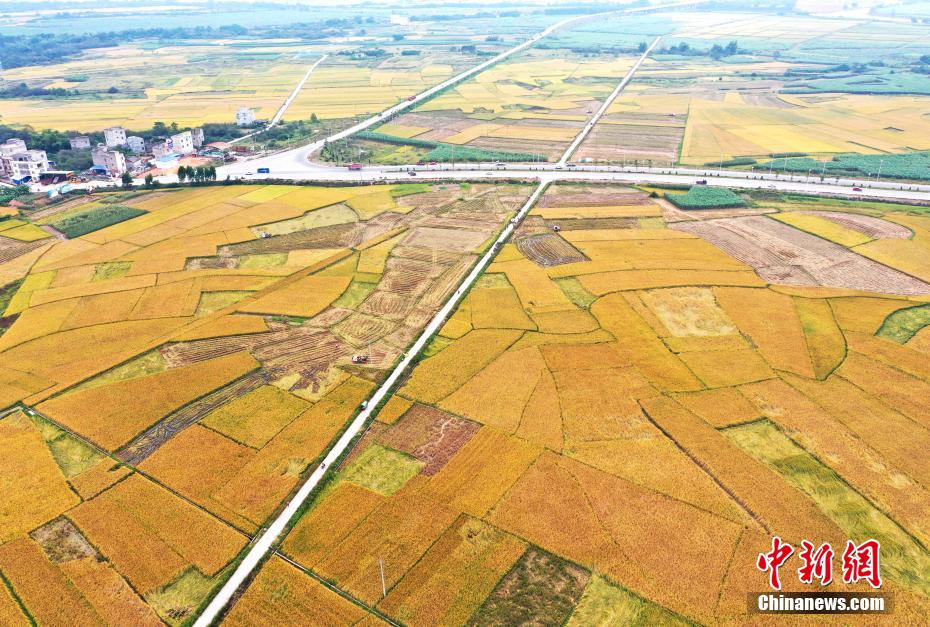 金秋時節(jié),稻谷飄香。行走在廣西鄉(xiāng)村田間地頭,金黃的稻浪隨風起伏,農(nóng)民忙著收割晚稻,晾曬稻谷,臉上洋溢著豐收的喜悅。在廣西崇左市寧明縣明江鎮(zhèn)岑岳村,從空中俯瞰,金黃的稻谷好似為大地鋪上了一層黃金地毯,構(gòu)成一幅幅美麗的豐收圖景。 周貽剛 攝