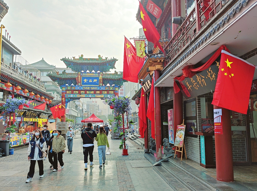 10月7日,省城食品街,在查驗雙碼、測量體溫后,游客愉快購物、體驗美食,享受假期的輕松和歡樂。