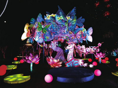 在百花的傳說中,十二月令花神的傳說最令人神往。在桃花島上,梅花、杏花、桃花、牡丹、石榴、蓮花、蜀葵、桂花、菊花、木芙蓉、山茶、水仙,各路花神身著華服,在所屬花燈前翩翩起舞,燈光人影交織,盡顯浪漫?!笆ㄉ瘛泵客矸謺r段在桃花云臺,跳起如云似幻的祈福舞,笑容明媚,面若桃紅,傾倒眾人。無人機(jī)組集合成孔明燈形狀,載著每個人最虔誠的心愿緩緩升空。“十二花神”隨即走下“神臺”,出沒在各個角落,讓整個桃花島亦真亦幻。穿行其中,與“花神”擦肩而過,仿佛穿越時空,進(jìn)入神話世界。