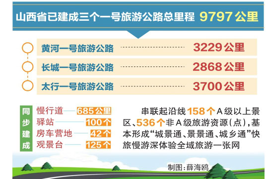 截至今年10月10日,山西省已建成三個一號旅游公路總里程9797公里。其中,黃河一號旅游公路3229公里、長城一號旅游公路2868公里、太行一號旅游公路3700公里,同步建成慢行道685公里、驛站100個、房車營地42個、觀景臺125個,串聯(lián)起沿線158個A級以上景區(qū)、536個非A級旅游資源(點),基本形成“城景通、景景通、城鄉(xiāng)通”快旅慢游深體驗全域旅游一張網。