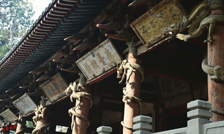 八條盤龍各抱定一根大柱,張口向前,怒目利爪,躍躍欲動(dòng),一派生氣。如今,雖近千年,木雕盤龍仍鱗片層層,須發(fā)根根,極其莊嚴(yán)威儀,難掩飛龍盤旋的氣勢(shì)。