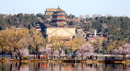 2024年3月19日,北京頤和園西堤,山桃花爭(zhēng)相盛開(kāi),與古建亭橋相映成景。丁幫學(xué)攝(人民圖片網(wǎng))