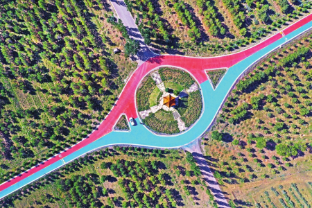 在得勝堡不遠(yuǎn)處,長(zhǎng)城一號(hào)旅游公路蜿蜒而過。車行其上,仿佛置身于絢爛的畫卷之中,紅藍(lán)黃交織的道路色彩鮮艷;環(huán)顧四周,云海翻騰。長(zhǎng)城驛站為游客提供休憩之所,路旁是遼闊的綠丘和連綿的樹林。