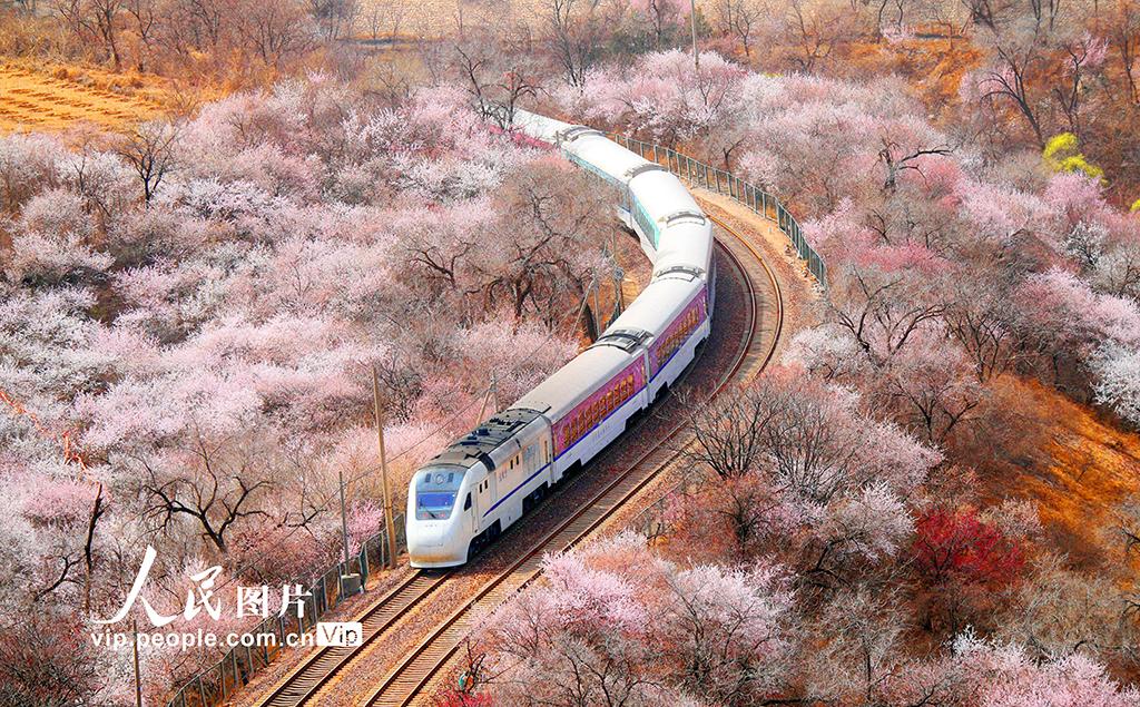 2025年3月23日,居庸關(guān)長(zhǎng)城腳下繁花似錦,北京市郊鐵路S2線(xiàn)列車(chē)悠然穿行其間,該線(xiàn)列車(chē)因途經(jīng)多處風(fēng)景名勝,被贊譽(yù)為“開(kāi)往春天的列車(chē)”。張秀科攝(人民圖片網(wǎng))