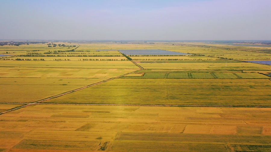 初夏時節(jié),安徽省潁上縣廣袤大地上麥香四溢。麥田在陽光下泛著金黃,麥浪滾滾,收獲在望。麥田、村落、河流、阡陌構成一幅美麗的田園風光。(徐紅梅)??