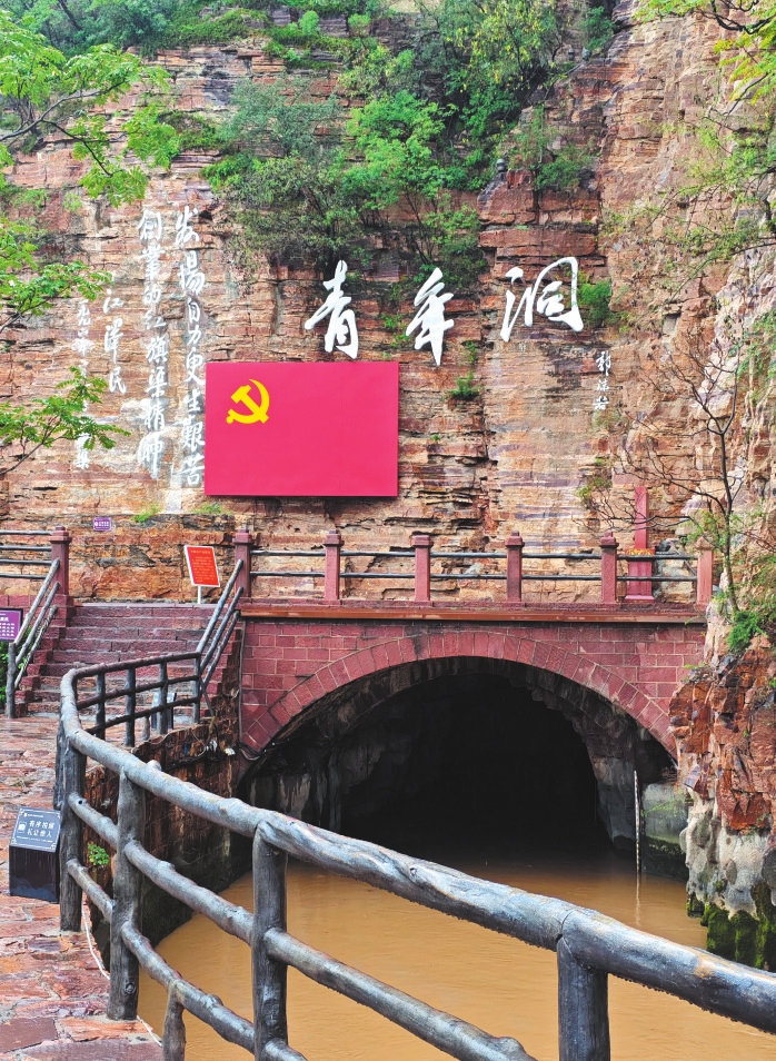 面對(duì)干旱缺水的生存困境,林縣人民以“一錘一釬一雙手”苦干十年,削平1250座山頭,鑿?fù)?11個(gè)隧道,在太行山間建成全長(zhǎng)1500公里的水利工程,創(chuàng)造了開(kāi)通“人工天河”的世界奇跡。青年洞是紅旗渠的咽喉所在,攀援在懸崖峭壁之上,縣里挑選了300名青年組成突擊隊(duì),晝夜施工,每人每天只有六兩糧。為了填飽肚子,他們上山挖野菜,下河撈水草充饑,以愚公移山精神挖山不止,經(jīng)過(guò)17個(gè)月的苦戰(zhàn),終于鑿?fù)?16米長(zhǎng)的隧道。
