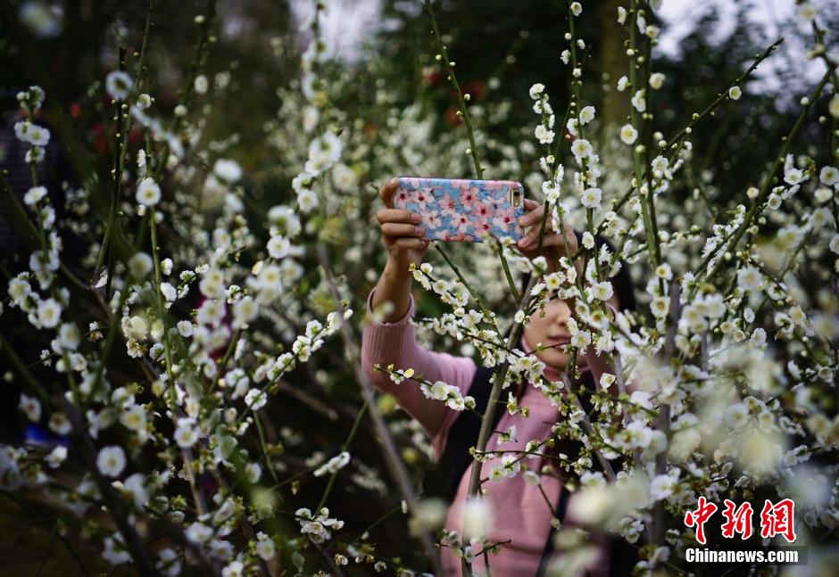 2月20日,三湘大地氣溫逐漸回升,湖南省森林植物園千株梅花競相綻放,眾多游客置身于花海中,與這難得的美景合影留念。 楊華峰 攝