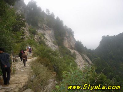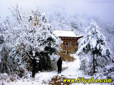 北武當(dāng)山主峰四周幾乎都是陡壁懸崖,只有一條人造“天梯”可攀。來到山腳下,過五里黃土、五里沙路,便是1400余級就山鑿筑的石階,凡險(xiǎn)峻之處,設(shè)有鐵索扶手。石階一線疊置,從下仰視,宛如“天梯”。游人攀登,每一步都可聽到悠揚(yáng)頓挫的“石音”,形成獨(dú)特的“石樂”絕景。沿著石階,奇松異石、廟宇石刻,掩沒在蔥郁的山林植被之中,相間點(diǎn)綴,相映成趣。主要的山石景觀有:古猿望日、石豬受難、九龍出洞、石象守山、天壺傾露、石羊朝圣、石龜下蛋、石虎、石蛤蟆、龜蛇斗智等。最令人稱奇的是“龜蛇斗智”奇觀,相傳神龜和青蛇不安心修道,互相格斗,經(jīng)過七七四十九天的麈戰(zhàn),神龜節(jié)節(jié)敗退,青蛇步步緊逼。其時(shí),恰逢真武大帝返宮,見狀,輕輕用手指一點(diǎn),龜蛇便動彈不得,從此永久停留在這里,成千古一絕——“蛇石”虎視眈眈,“龜石”尾臨懸崖,萬斤重石,峭立崖畔,用力一推或經(jīng)風(fēng)一吹,便搖搖欲墜,令人心懸,所以又稱風(fēng)動石,為我國罕見的景觀之一。主要的奇松景觀有:鴛鴦松、迎客松、托天松、母子松等。最使人嘆為觀止的是“擎天探海松”,其松立于石階半道,樹身技分兩杈,一直刺青天,一枝瞰群峰。近金頂?shù)悄咸扉T石階,旁邊陡崖上刻有“喬松”二字,據(jù)載為清代道光年間永寧州牧王繼賢手跡?,F(xiàn)存喬松樹樁直徑近1米,可以想見其昔日雄姿。主要的懸崖峭壁有:千仞壁、舍身崖、鷹嘴崖等。還有呈垂直分布的植被,其色彩和花期隨季節(jié)變化,給北武當(dāng)山披上了“春粉、夏艷、秋紅、冬白”的盛裝。登臨武當(dāng)之巔,一覽眾山,但見遠(yuǎn)山蒼茫,近日含黛,松風(fēng)撲面,白云飄逸;只聞松濤陣陣,山泉潺潺,鳥語唧唧,似琴弦輕撥;夏秋之季,如晴空萬里,金頂之下,叢林景觀相間,似七彩織錦;白云遠(yuǎn)處,群山連綿,猶如萬龍翻騰,極為壯觀。