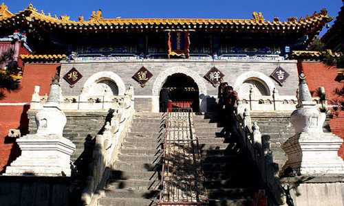 臺懷鎮(zhèn)鎮(zhèn)北有一小峰,人稱靈鷲峰,亦名菩薩頂。所以稱之為靈鷲峰,是因?yàn)樗牡乩硇蝿蓊H似古印度摩揭陀國王舍城東北部釋迦牟尼佛說法的靈鷲峰故名。據(jù)佛教史籍記載,東漢時期,我國佛教最初的傳播人攝摩騰和竺法蘭來到臺懷鎮(zhèn),見今菩薩頂?shù)男蝿蓊H似印度的靈鷲峰,因而命名之。所以也稱靈鷲峰為菩薩頂,佛教徒傳說文殊菩薩曾在峰頂顯靈和說法。