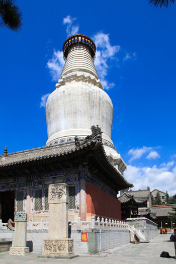 塔全稱為釋迦牟尼舍利塔,俗稱大白塔。塔身?yè)艿囟鹆杩崭呗枺谖迮_(tái)山群寺簇?fù)碇骂H為壯觀,人們把它做為五臺(tái)山的標(biāo)志。此塔通高七十五點(diǎn)三米,環(huán)周八十三點(diǎn)三米。塔基為正方形,塔身狀如藻瓶,粗細(xì)相間,方圓搭配,造型優(yōu)美。塔頂蓋銅板八塊成圓形,按乾、坎、艮、震、巽、離、坤、兌等八卦地位安置。塔頂中裝銅頂一枚,高約五米,覆盤二十一米多,飾有垂檐三十六塊,長(zhǎng)兩米多;每塊垂檐底端掛風(fēng)鐘三個(gè),連同塔腰風(fēng)鐘在內(nèi),全塔共有二百五十二個(gè)。風(fēng)歡鈴動(dòng),叮鐺作響。