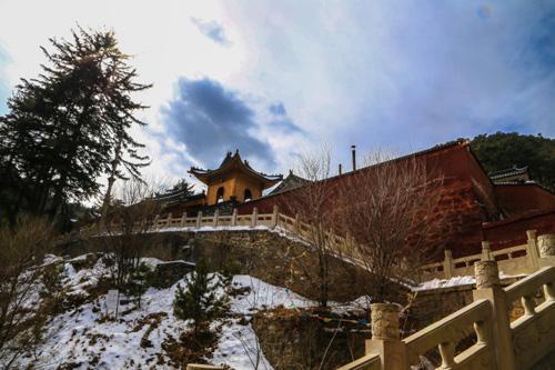 鎮(zhèn)海寺建在陡峻的石山嘴上,海拔1600米。寺院因山借勢(shì),錯(cuò)落有致,從山腰到山頂形成步步高升格局。寺前有幡桿、石獅,寺內(nèi)有殿堂樓房100間。鎮(zhèn)海寺占地一萬(wàn)六千平方米,有殿堂樓房一百間。該寺的主要建筑是一進(jìn)三重大殿,天王殿內(nèi)兩壁有有四大天王,正中供彌勒佛;中殿內(nèi)有三尊坐佛,背后飾有“靈光”,一色金身;后殿內(nèi)正中有文殊菩薩坐臥獅塑像,前側(cè)又有三尊金身坐像。從中殿西側(cè)的小門穿過(guò)去有一套院,院內(nèi)有乾隆五十一年建造的十五世章嘉活佛墓塔。在長(zhǎng)七點(diǎn)九米、寬七米、高一點(diǎn)三米的平臺(tái)上,立有高九米多、狀如藻瓶的石塔。塔基八角,每角塑有大力士,基座八面雕有人物圖,并著彩。塔腹正中雕有三尊坐佛,另外圍有八尊站像。圓腹之上,立有層層內(nèi)縮的尖頂。這座塔的造型別致,雕刻精細(xì)華美。