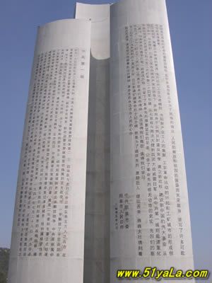 高40公尺的主碑 ,形如一把鋒利的刺刀 。主碑的三個面上,分別鐫刻著彭真、徐向前、薄一波的題詞。彭真的題詞是“戰(zhàn)績輝煌,永垂史冊”;徐向前的題詞是“參加百團大戰(zhàn)的烈士們永垂不朽”;薄—波的題詞是“百團大戰(zhàn),抗日戰(zhàn)爭中最光輝的一頁,必將載諸史冊,永放光芒?!?/p>